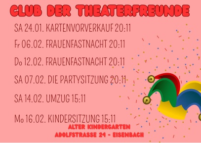 Unsere regelmäßig stattfindenden Veranstaltungen sind Kappensitzungen und Theateraufführungen. Diese werden von den Mitgliedern in eigenregie organisiert sowie gestaltet.